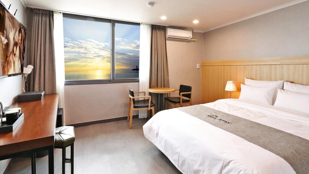 객실은 생각보다 넓고 쾌적했어요. 큰 창문을 통해 푸른 동해 바다가 한눈에 들어오는 멋진 뷰는 감탄을 자아냈습니다. 폭신한 침구와 깨끗한 침구류 덕분에 꿀잠을 잘 수 있었고, 샴푸, 린스, 바디워시 등 어메니티도 잘 갖춰져 있어 편리했습니다. 특히 객실 내에 작은 테이블과 의자가 있어 차 한잔의 여유를 즐기며 바다를 감상할 수 있었던 점이 좋았습니다.
